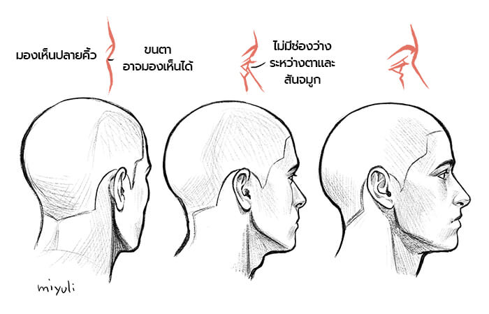 เมื่อใบหน้าอยู่ในมุมกึ่งด้านข้าง อาจเห็นแค่ปลายคิ้วและขนตาเท่านั้น