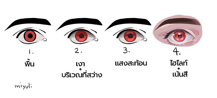 เมื่อดูจากขั้นตอนพื้นฐานทั้ง 4 แบบนี้ จะเห็นว่าการวาดส่วนสีขาวของดวงตาให้มืดลงจะช่วยให้ส่วนที่ไฮไลต์ของดวงตาเด่นมากยิ่งขึ้น