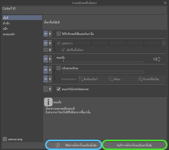 อุดช่องว่าง (Close Gap): หากตั้งค่าเป็น 0 เมื่อลงสีพื้นที่ที่มีช่องว่างระหว่างเส้น สีจะเติมลงในพื้นที่ที่ไม่ได้ปิดล้อม