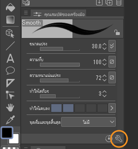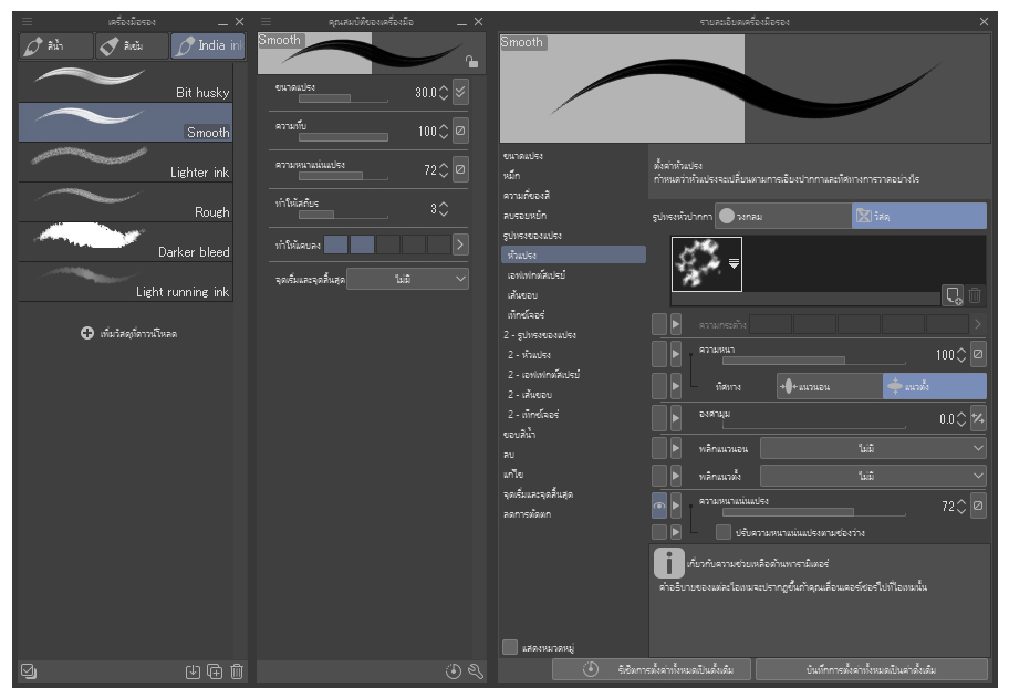 ในหน้าต่างรายละเอียดเครื่องมือรอง จะเห็นคุณสมบัติต่างๆ ที่ใช้ปรับแต่งแปรง เช่น ขนาดแปรง โค้ง ความทึบ และการตั้งค่าที่ช่วยแก้ไขเส้น เช่น จุดเริ่มและจุดสิ้นสุด