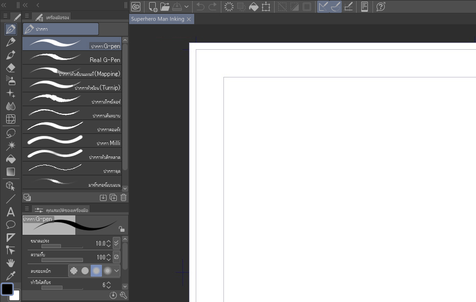 Clip Studio Paint มีแปรงหมึกอินเดียหลายแบบที่เหมาะสำหรับการวาดคอมมิกซูเปอร์ฮีโรติดตั้งอยู่ในโปรแกรมเลย โดยส่วนตัว ผมชอบหมึกอินเดียแบบเรียบ (India Ink Smooth) เพราะมีเส้นที่คมชัดและเท็กซ์เจอร์ที่ละเอียด