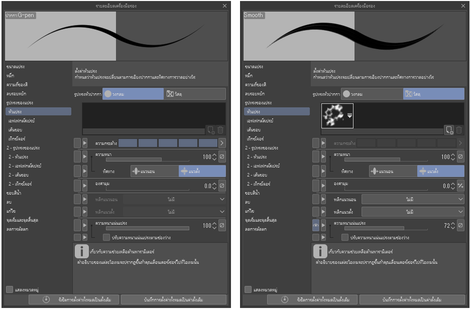 ถ้าอยากได้เส้นปากกาแบบ G-Pen ให้ดูที่ส่วน ปากกา G-pen ในเครื่องมือรองของปากกาได้เลย เครื่องมือนี้จะให้เส้นที่สวยและบางถ้าใช้แรงกดเบาๆ แต่ก็ยังวาดให้หนาขึ้นได้เมื่อกดแรงขึ้น แต่จะไม่ขยายมากเท่ากับแปรง แต่ก็คงต้องการแบบนั้น เพราะปากกา G-Pen ของจริงก็เป็นแบบนี้!