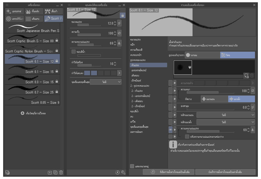 เครื่องมือพวกนี้ออกแบบมาเพื่อจำลองความกว้างที่สม่ำเสมอของเส้นมัลติไลน์เนอร์ในชีวิตจริง ผมสแกนเท็กเจอร์ของหัวปากกาที่วาดจากเครื่องมือจริง และพยายามตั้งขนาดให้ตรงกับขนาดเส้นจริงในกระดาษ ดังนั้น 0.1 จะให้เส้นที่บางกว่า 0.3 อย่างชัดเจน แต่ถ้าดูดีๆ จะเห็นว่าเส้นขนาด 0.3 วาดให้บางได้ไม่เท่ากับแปรง หรือ ปากกา G-Pen แม้ว่าจะกดเบาๆ