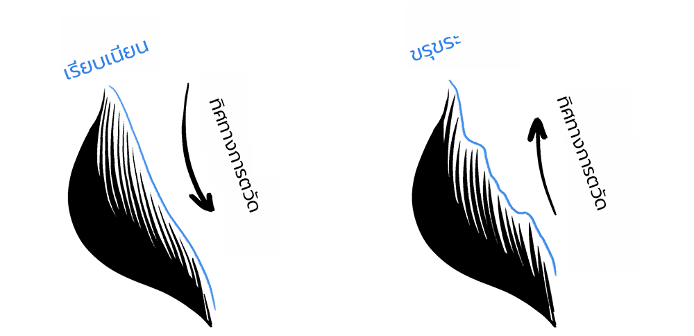 หลายคนอาจจะคิดว่าการลงหมึกก็เหมือนกับการวาดดินสอที่ก็แค่วาดรูปร่างอย่างที่มันเป็น แต่การลงหมึกให้มีชีวิตจะต่างออกไปตรงที่วาดให้ความหนาของเส้นสัมพันธ์กับปริมาณของแสงที่ตกกระทบในแต่ละด้านของตัวแบบ