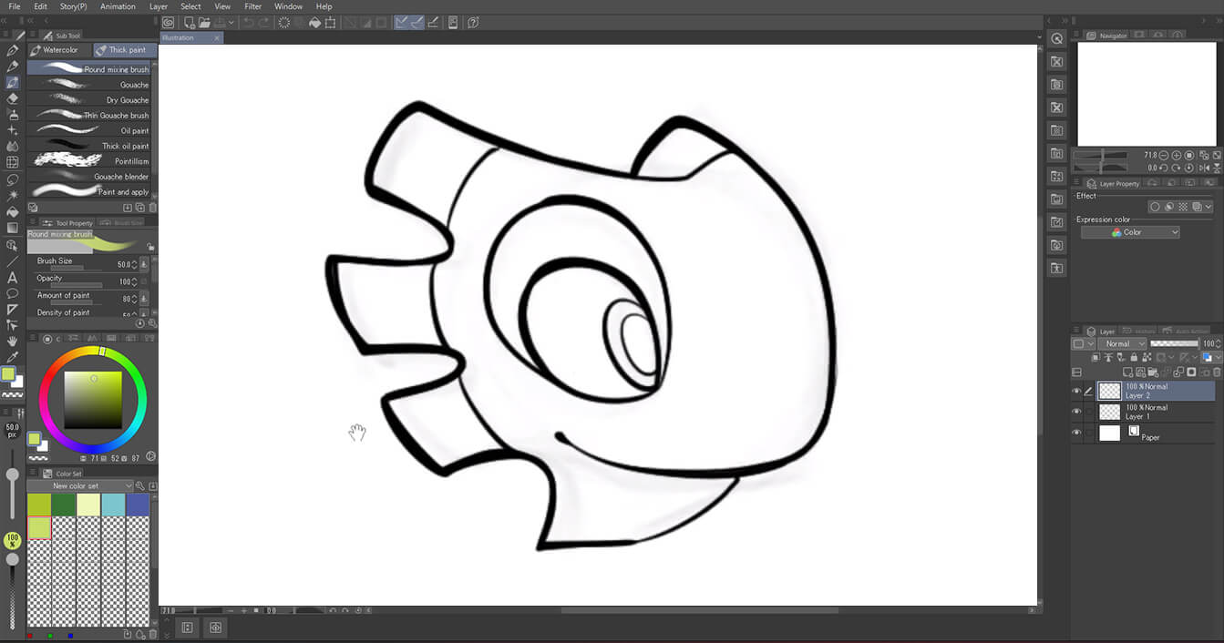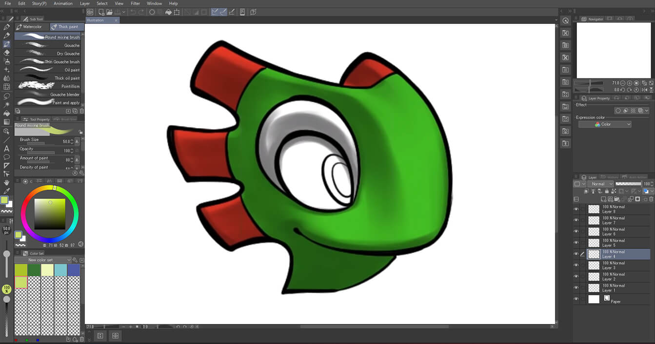 ก่อนอื่น ผมจะเลือกสีที่คล้ายกับสีหลักที่ใช้เติม จากนั้นผมจะทำให้สีนั้นเข้มขึ้น แล้วใช้แปรงปากกาขนาดใหญ่ระบายทับทั้งเลเยอร์เพื่อให้สีสม่ำเสมอและสร้างสีฐาน หลังจากนั้น ผมจะเข้าไปในแต่ละส่วนและลงสีเส้นให้เข้ากับบริเวณโดยรอบ ตัวอย่างเช่น สีแดงของหงอนและสีฟ้าของดวงตาจะถูกใช้เป็นสีพื้นฐานในการลงสีเส้นโดยรอบ