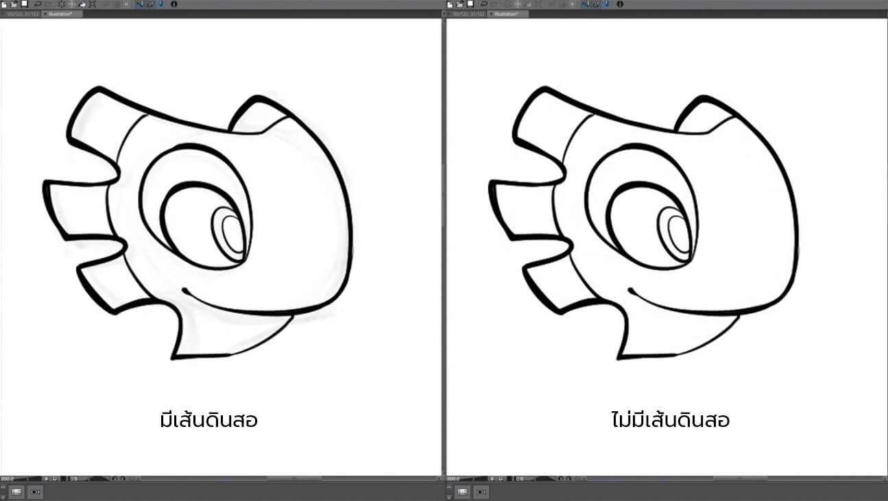 สังเกตว่าจะมีขอบเงาสีขาวรอบๆ เส้นในภาพด้านบน นี่เป็นปัญหาใหญ่มากสำหรับการพิมพ์ บางครั้งเพลตพิมพ์อาจมีการคลาดเคลื่อนเล็กน้อย ดังนั้นการใช้ฟีเจอร์ปรับสเกลบริเวณจึงช่วยจัดการกับปัญหาที่อาจเกิดขึ้นในการพิมพ์ได้