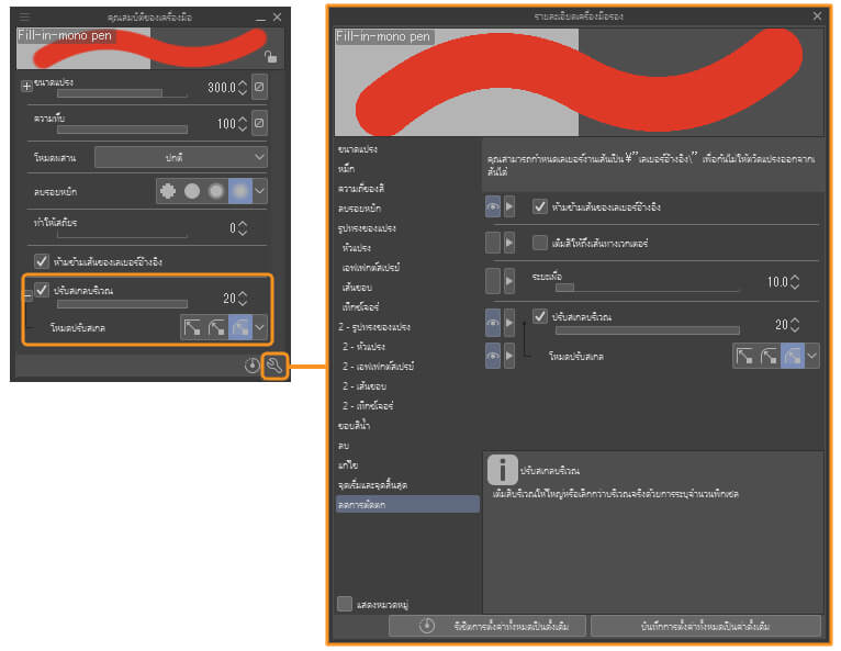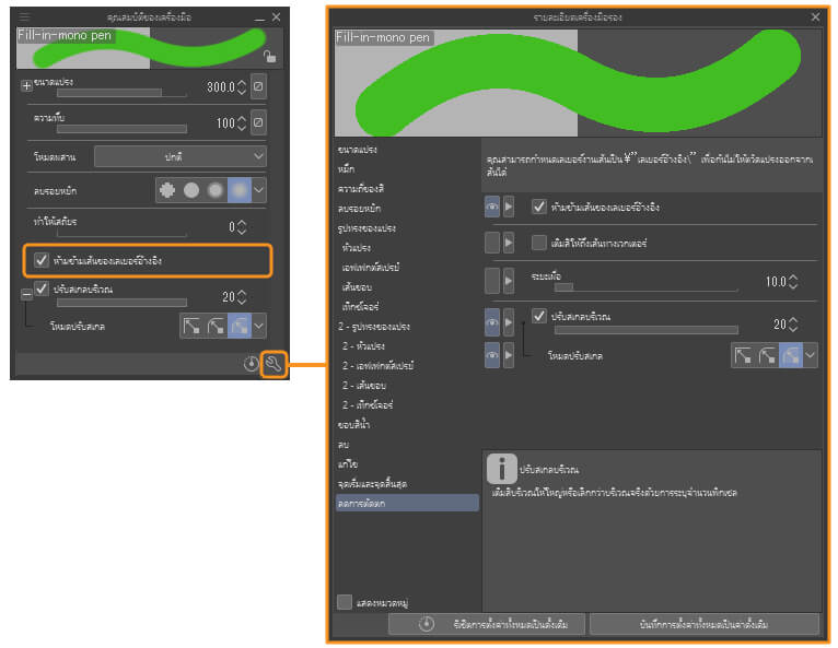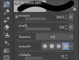ต่อไป ผมจะสลับไปใช้เครื่องมือมาร์กเกอร์ที่อยู่ในพาเล็ตเครื่องมือรองปากกา แล้วเลือกตัวเลือกเครื่องมือปากกาฟิลอินโมโน (Fill-in mono pen) ตามที่เห็นในภาพด้านล่าง โดยส่วนตัวแล้ว ผมจะเปิดใช้ลบรอยหยักสำหรับปากกานี้ตอนวาด ผมไม่กังวลเรื่องรอยหยัก เพราะผมวาดการ์ตูนสีเต็มรูปแบบ มันจึงไม่ค่อยสำคัญสำหรับผมเท่าไร