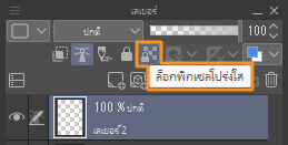 สุดท้าย ผมจะใส่สีให้กับเส้น หากดูในพาเล็ตเลเยอร์ จะเห็นตัวเลือกที่เรียกว่าล็อกพิกเซลโปร่งใส (Lock transparent pixels) หากผมคลิกที่ตัวเลือกนั้น การระบายสีใดๆ ที่ทำกับเลเยอร์จะถูกจำกัดอยู่แค่ภายในเส้นเท่านั้น