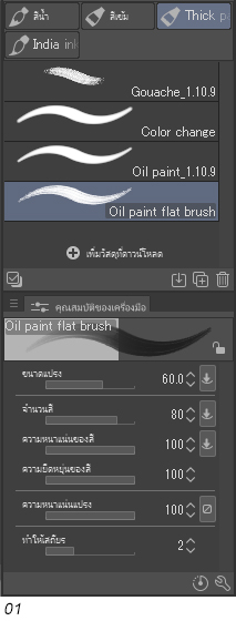 จะเห็นว่าผมเปลี่ยน “ความแข็ง” “ความหนา” “ทิศทางการใช้งาน” และ “ความหนาแน่นของแปรง” ลองปรับแต่งตามนี้ และอย่าลืมทดลองตั้งค่าเพื่อหาสไตล์ที่ชอบ แปรงที่ผมสร้างมีขอบมุมในรอยแปรงและมีความอ่อนนุ่มเล็กน้อย (โดยการลดค่า “ความแข็ง”) เป็นวงรี ไม่กลม และไม่ทึบเต็มที่ การตั้งค่านี้จะช่วยให้เราสร้างรอยแปรงที่หลากหลายมากขึ้น ซึ่งสามารถทาทับกันได้ในเทคนิคที่เรียกว่า “การสร้างชั้น”