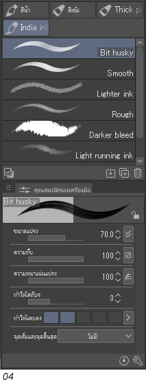 ถ้าต้องการให้ภาพมีความลึกและตัวเลือกในการแสดงแสงและมิติมากขึ้น การใส่สีเทาหนึ่งหรือสองเฉดสีจะช่วยได้ สิ่งนี้จะช่วยลดความคมชัดระหว่างดำและขาวล้วน และสร้างพื้นที่พักสายตา สำหรับองค์ประกอบของภาพนี้ เราจะใช้แปรงจากหมวดหมู่หมึกอินเดีย (India Ink) (ตัวลัด “b”) ที่เรียกว่า “บิต ฮัสกี้ (Bit Husky)” โดยใช้การตั้งค่ามาตรฐาน (รูปที่ 04) เป้าหมายของแบบฝึกหัดนี้คือการเริ่มเติมสีในพื้นที่ต่าง ๆ โดยไม่ทำให้มันดูแบนราบเกินไป การเพิ่มการเคลื่อนไหวให้กับรอยแปรงจะทำให้ภาพดูมีชีวิตชีวามากขึ้น และช่วยเพิ่มความน่าสนใจให้กับองค์ประกอบทั้งหมดในภาพ
