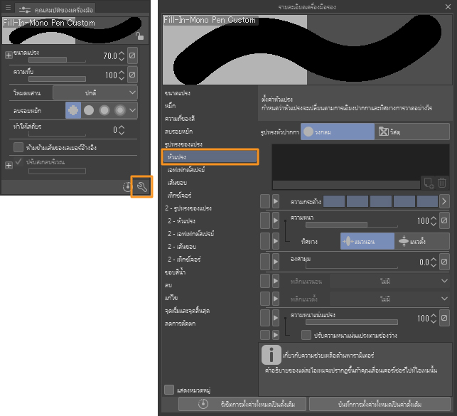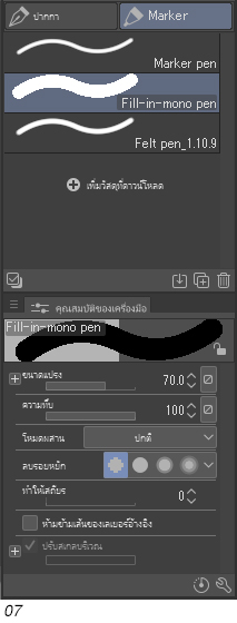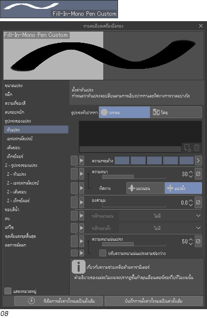 เริ่มต้นด้วยการเลือก “ปากกาฟิลอินโมโน (Fill-In-Mono Pen)” คลิกขวาและเลือก “ทำซ้ำเครื่องมือรอง” แล้วเปลี่ยนชื่อแปรง (ผมเปลี่ยนเป็น “ปากกาฟิลอินโมโนปรับแต่ง”) คลิกที่ไอคอนการตั้งค่า (มุมขวาล่าง) และปรับแต่งมาร์กเกอร์ที่เมนู “หัวแปรง” ด้วยการตั้งค่าต่อไปนี้ (รูปที่ 08):