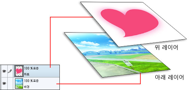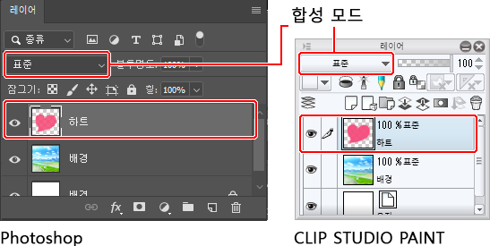 합성 모드의 주 종류에 대해서 소개합니다. 여기에서는 위 레이어(하트 이미지)의 합성 모드를 변경하여 어떤 효과를 얻을 수 있는지 살펴봅시다.