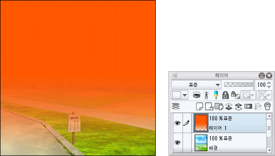 배경 이미지에 주황색 그라데이션을 그린 레이어를 겹칩니다.