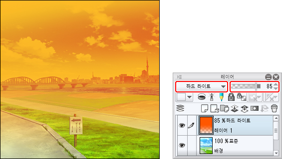 주황색 그라데이션을 그린 레이어를 선택하고 [합성 모드]를 [하드 라이트]로 [불투명도]를 85%로 설정합니다.