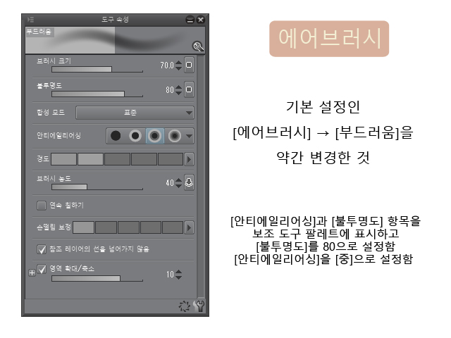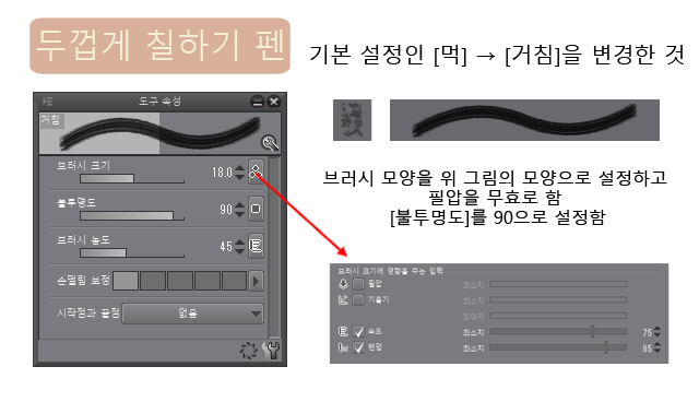 여기에서는 제가 일러스트에서 사용한 브러시 설정과 칠하는 법을 몇 가지 소개하겠습니다.