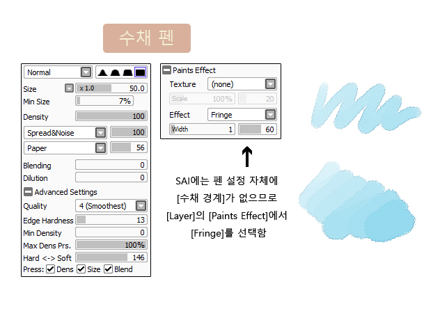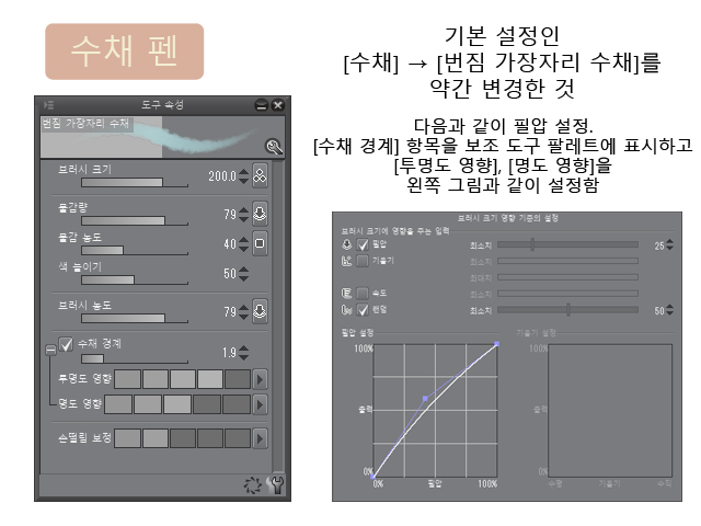 수채 채색은 ‘연한 색이 특징적인 아날로그적인 느낌이 나는’ 채색법이므로 아날로그 느낌을 내기 위해 ‘수채 경계’나 ‘텍스처’ 등을 설정한 붓을 사용합니다.