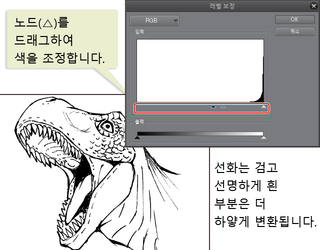 그 다음 [레벨 보정]으로 선을 선명하게 합니다.