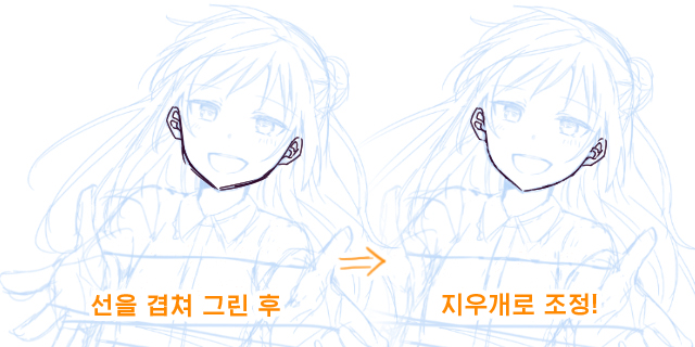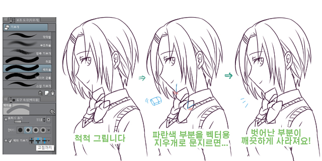 벗어난 선을 지울 때 래스터 레이어라면 필요한 선도 지우게 되어 번거롭지만 [지우개] 도구의 [벡터용]을