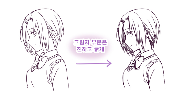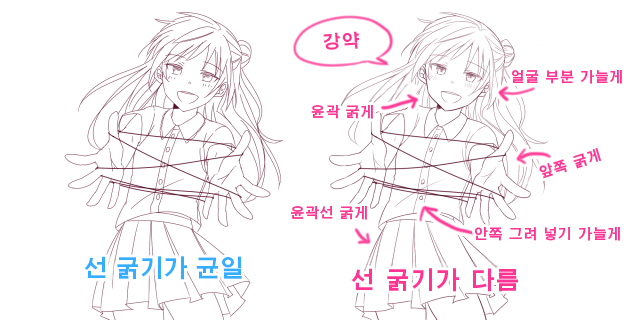 컬러 일러스트를 칠할 때 빛이 닿는 부분은 색을 연하게, 그림자가 지는 부분은 진하게 칠합니다. 선화도 마찬가지로 빛이 닿는 부분은 가늘게, 그림자가 지는 부분은 굵게 그리면 선화만으로 입체감이 생깁니다.