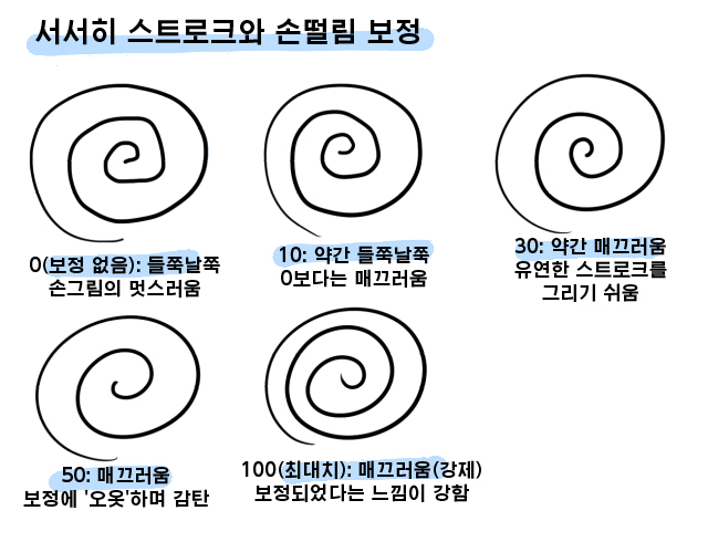 보정의 선호도는 필압이나 사용 중인 펜 태블릿 등에 따라 제각각이므로 다양하게 시도하여 최적값을 찾아 보도록 합시다.
