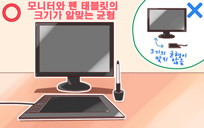 우선 지금 사용 중인 컴퓨터 모니터(디스플레이) 크기와 펜 태블릿 크기의 비율에 대해 재검토해 봅시다.