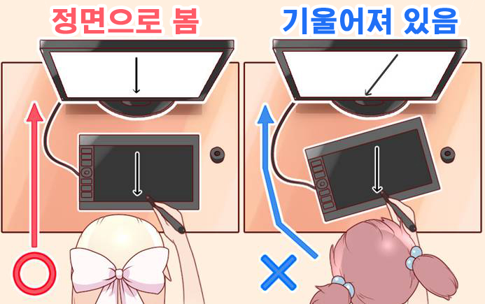 · 모니터 화면에 대해 펜 태블릿 위치를 정면으로 배치