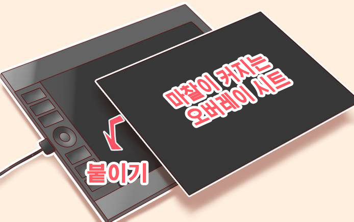 마찰이 커지는 각종 보호 시트(오버레이 시트)가 시판 중이므로 우선 그걸 사서 펜 태블릿에 붙이면 잘 미끄러지지 않게 됩니다.