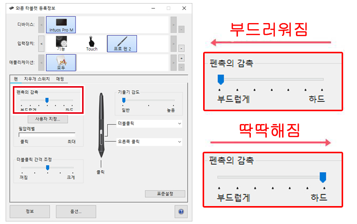 ‘펜이 딱딱해서 답답한 분’은 ‘펜촉의 감촉’ 슬라이더를 왼쪽으로 움직이면 펜이 부드러워집니다.