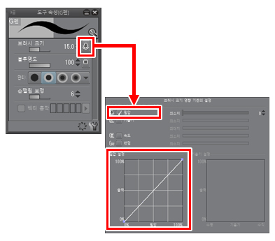 필압을 선택하고 그 아래의 필압 설정 그래프를 조정합니다.