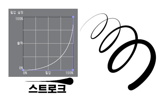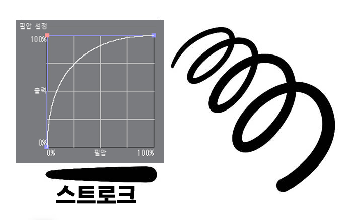 펜을 펜 태블릿에 가볍게 설치하면 이내 그리기에 적용되어 살짝 힘을 줄 때마다 브러시 크기가 점점 커지는 필압 설정 곡선입니다. 가한 필압이 50%를 넘으면 브러시 크기가 최대값에 근접하게 되어 그 이상 조정해도 그다지 변화가 없습니다.