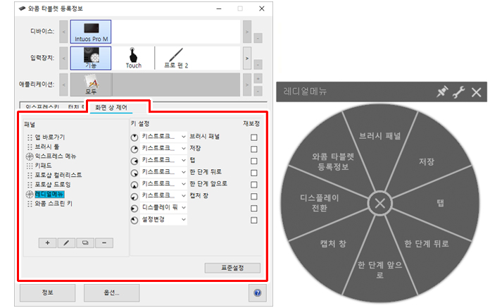 와콤 펜 태블릿 중에는 사실적인 하드웨어 버튼 외에 화면상에 일시적으로 디지털 버튼을 나타내 사용할 수 있도록 하는 ‘온스크린 컨트롤’이라는 기능이 탑재되어 있는 것이 있습니다.
