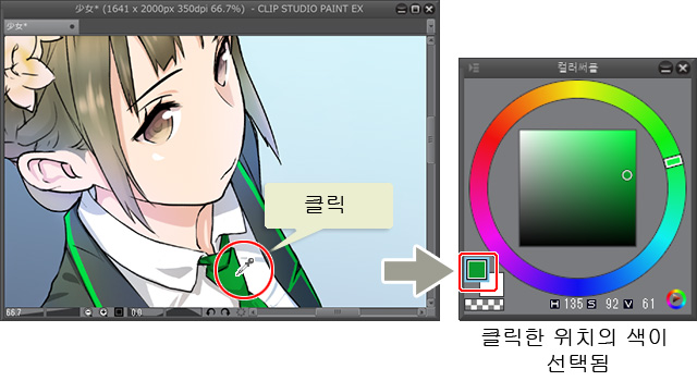 태블릿이나 마우스로 [Alt]키를 누른 채 캔버스(뷰)를 클릭하면 클릭한 위치의 색을 선택할 수 있습니다.