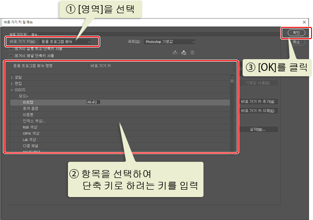 ② 항목을 선택하여 단축 키로 하려는 키를 입력