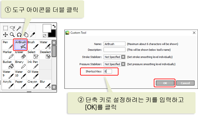 도구에 단축 키를 설정하려면 그 도구를 더블 클릭하면 [Custom Tool] 다이얼로그가 나타납니다.