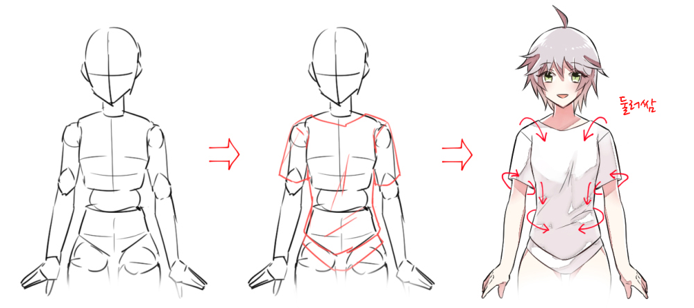 옷과 주름의 기본적인 그리는 법을 이해했으니 옷 그리는 법의 요령에 대해서 살펴봅시다.