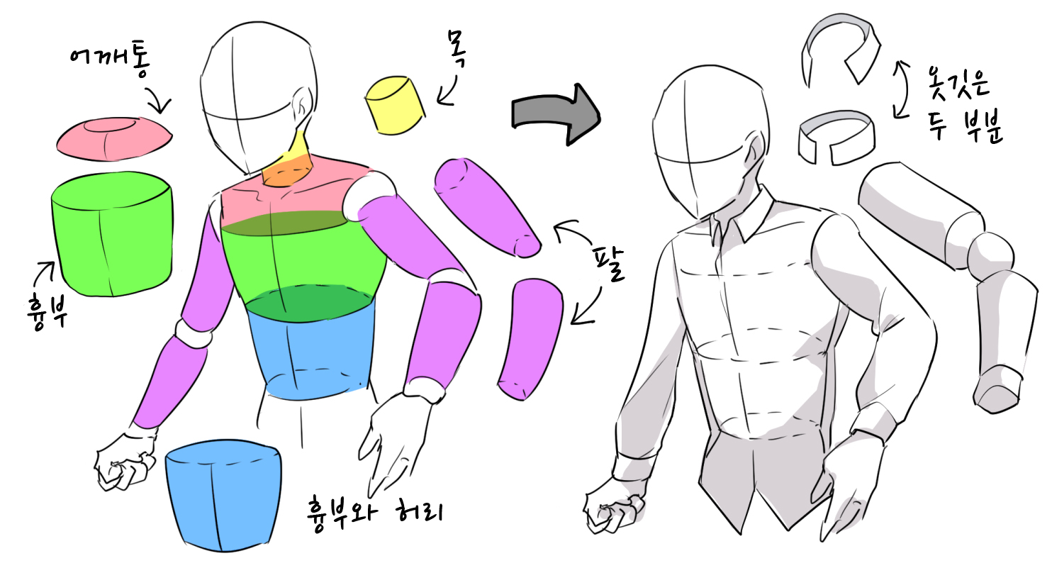 무작정 자세한 디테일을 그려 넣기 전에 몸와 마찬가지로 각 부분을 단순한 원통형으로 그립니다.