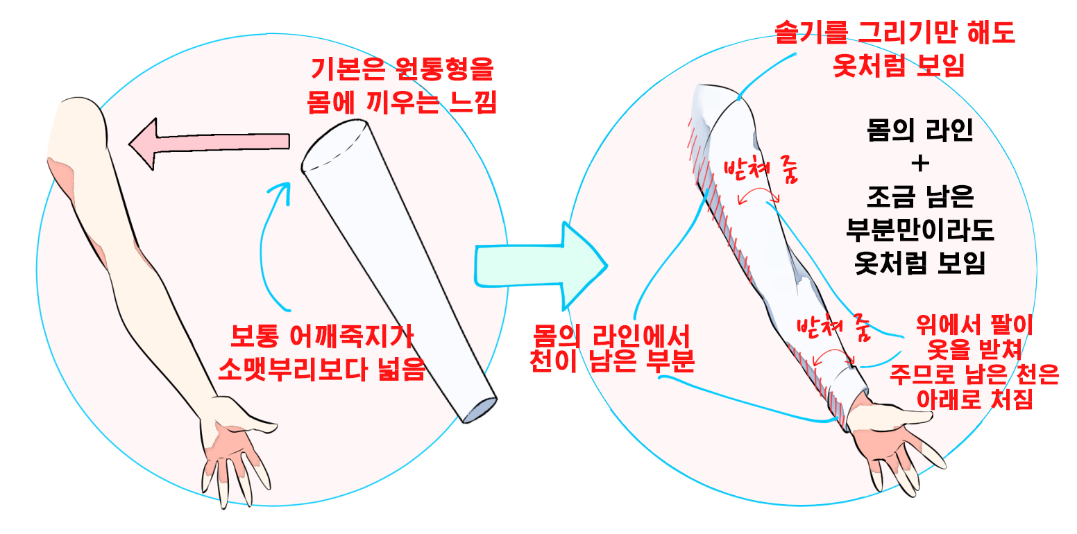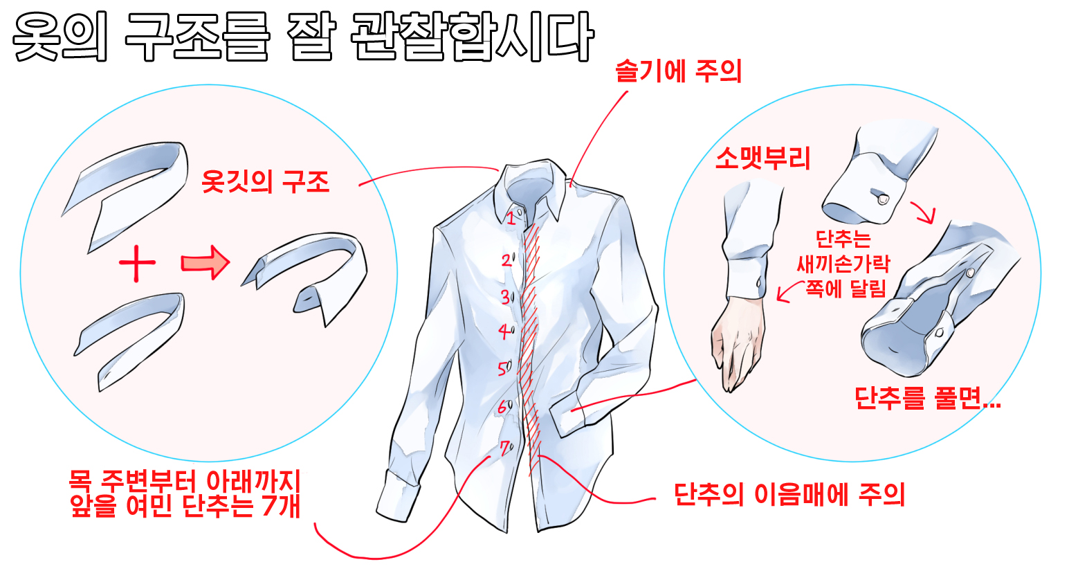 즉 옷을 잘 그리기 위해서는 옷의 구조를 알고 캐릭터를 입체적으로 파악해야 합니다.