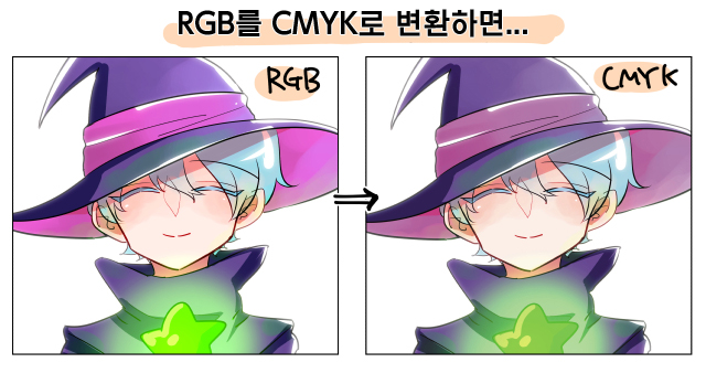 시험 삼아 RGB로 그린 일러스트를 CMYK로 변환하면 아래 그림처럼 됩니다.