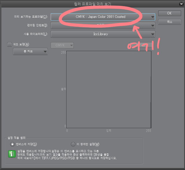 미리 보기 프로파일을 ‘Japan Color 2001 Coated’로 변경