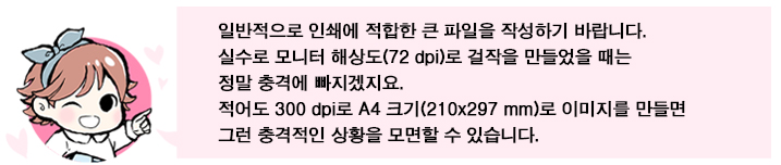 고해상도로 dpi는 높은 수치여야 합니다(컬러: 300 dpi, 만화: 1200 dpi). 또한 센티미터 단위로 올바른 이미지 크기를 설정해야 합니다.