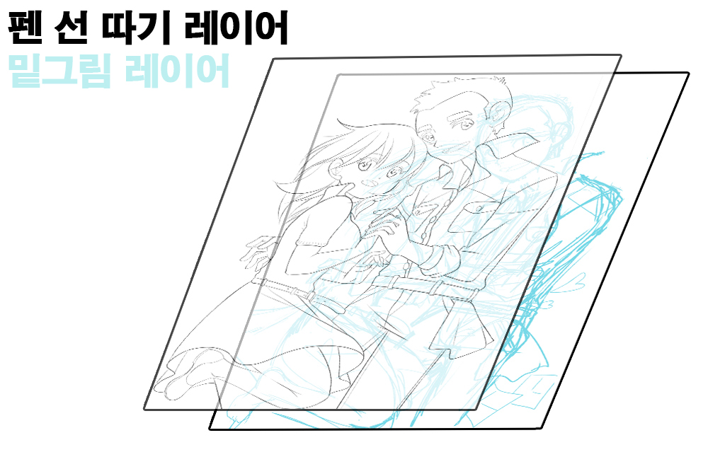 위에는 펜 선을 따기 위한 종이를 올려놓고 아래에는 비쳐 보이는 밑그림 종이를 깝니다.
