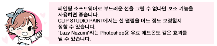 예전에는 이런 펜 선 따기를 위한 ‘원칙’을 지키면서 페인팅 소프트웨어에서 펜 선을 따는 것이 어려웠습니다. 그러나 최근의 소프트웨어에서는 [손떨림 보정] 등 다양한 기능이 있으므로 아주 편해졌습니다.