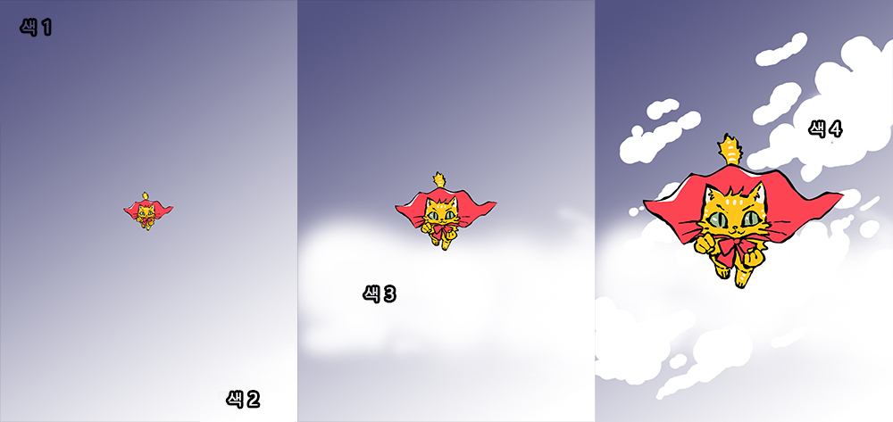 이미지 1: 보통 하늘의 저편은 그라데이션을 사용하여 그립니다. 대체로 낮에는 위(성층권 부분)가 어둡고 아래(지상 부근)가 밝은 그라데이션이 됩니다. 두 색을 정해 캔버스 전체에 그라데이션을 사용합니다.