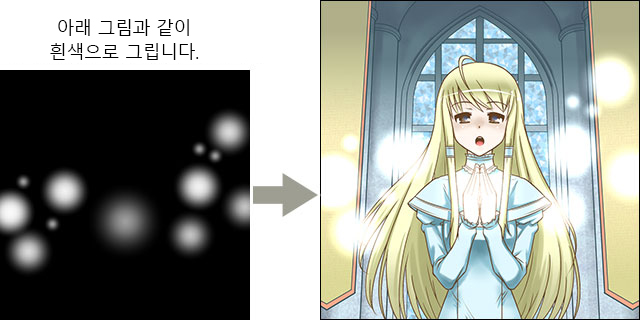 반짝거리는 효과를 넣을 범위를 수정하려면 레이어에 대해 효과를 지우려는 부분은 검은색으로, 효과를 추가하려는 부분은 흰색으로 칠합니다.