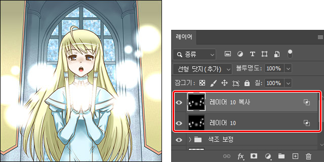 복제한 레이어에 대해 필터나 [흐리기] 도구로 흐리거나 레이어의 불투명도를 변경하면 반짝거림을 조정할 수 있습니다.