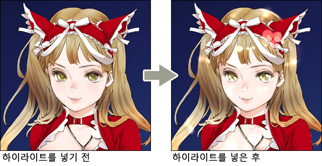 하이라이트에는 흰색뿐만 아니라 다른 색도 효과적으로 사용했습니다. 이 예에서는 머리카락과 리본은 주변색과 어울리도록 빨간색 계열의 하이라이트를 사용했습니다.