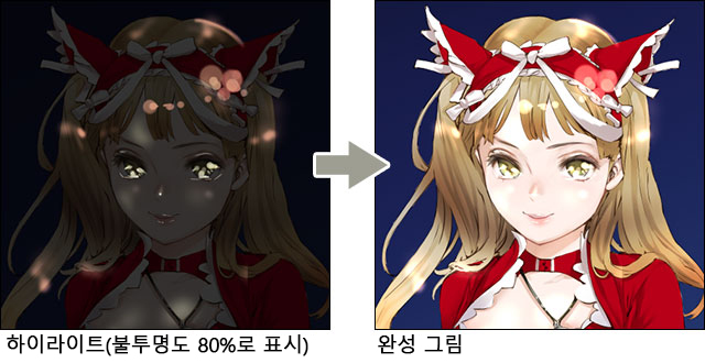 하이라이트의 레이어를 표준으로 하고 불투명도를 80%로 했습니다.