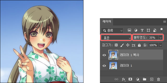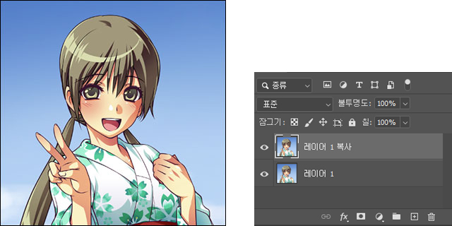 예를 들면 2단계에서 소개한 레이어의 색 조정 순서를 건너뛰고 복제한 레이어를 흐립니다.