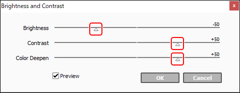 SAI에서는 [Filter] 메뉴 → [Brightness and Contrast]를 사용하여 색을 조정합니다.