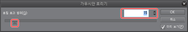 [가우시안 흐리기] 설정 화면이 표시되면 흐림 효과 범위를 설정합니다.